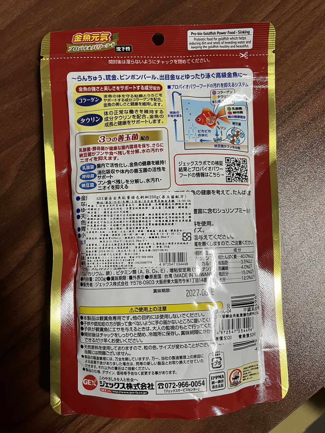 1.針對金魚所需的營養成分、腸道健康及鮮艷體色,而調配出來的均衡配方,易於消化吸收,含豐富的維他命、善玉菌(乳酸菌、酵母菌、納豆菌)、膠原蛋白和牛磺酸。